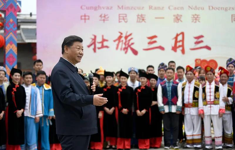 4月25日**27日,中共中央总书记、国家主席、中央军委主席习近平在广西考察。这是27日上午,习近平在南宁市广西民族博物馆外,同参加三月三“歌圩节”民族文化活动的各族群众亲切交流。新华社记者 谢环驰 摄