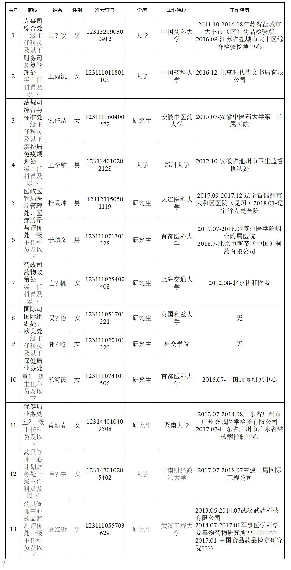 根据2020年度中央机关及其直属机构考试录用公务员工作有关要求,经过笔试、面试、体检和考察等程序,现对确定为拟录用公务员和参公单位工作人员的周欣等13人予以公示。公示期间如有问题,请向国家卫生健康委人事司反映。